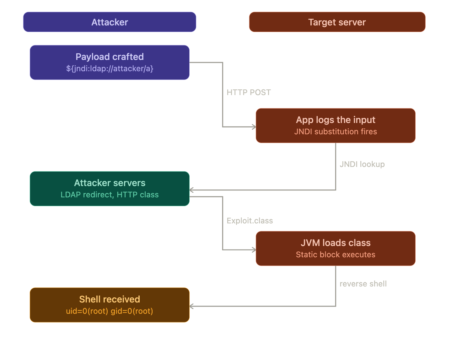 On the attacker machine we will need two services: a malicious LDAP server and an HTTP server serving a crafted Java class. The full chain looks like this: